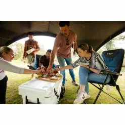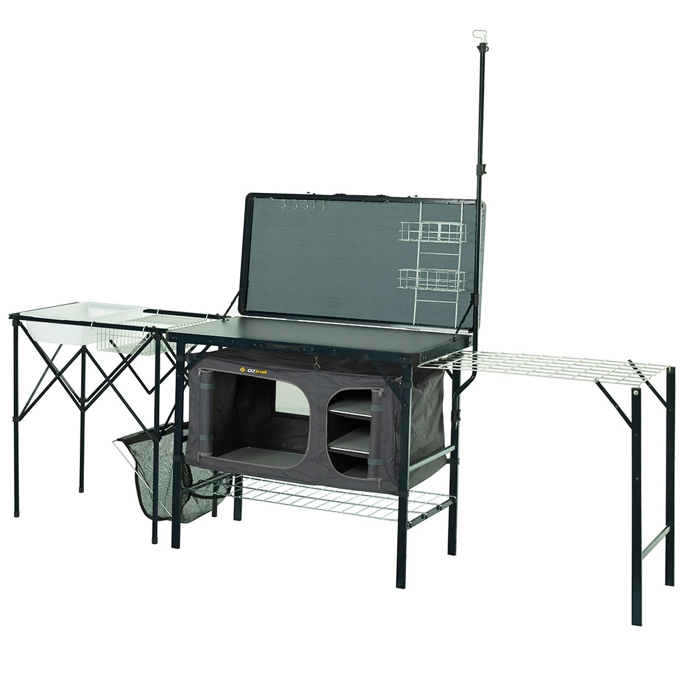 The All-in-one Kitchen XL is the complete camp set up, perfect for family camping. The standalone dishwashing station has integrated plastic sink and side wing drying rack makes washing up a breeze, while storage cupboard, wire racks and organizing hooks save precious bench space for cooking up a feast.